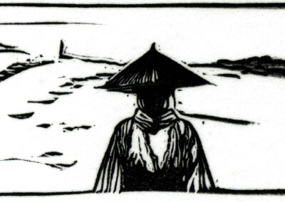 Sa rencontre avec la linogravure naît au fil de ses voyages au Japon. Inspiré par la force graphique et poétique des estampes traditionnelles, il explore cette technique en puisant dans ses propres photographies et souvenirs de voyage. Peu à peu, il construit une pratique personnelle centrée sur la gravure détaillée et l’impression manuelle sur papier de mûrier.